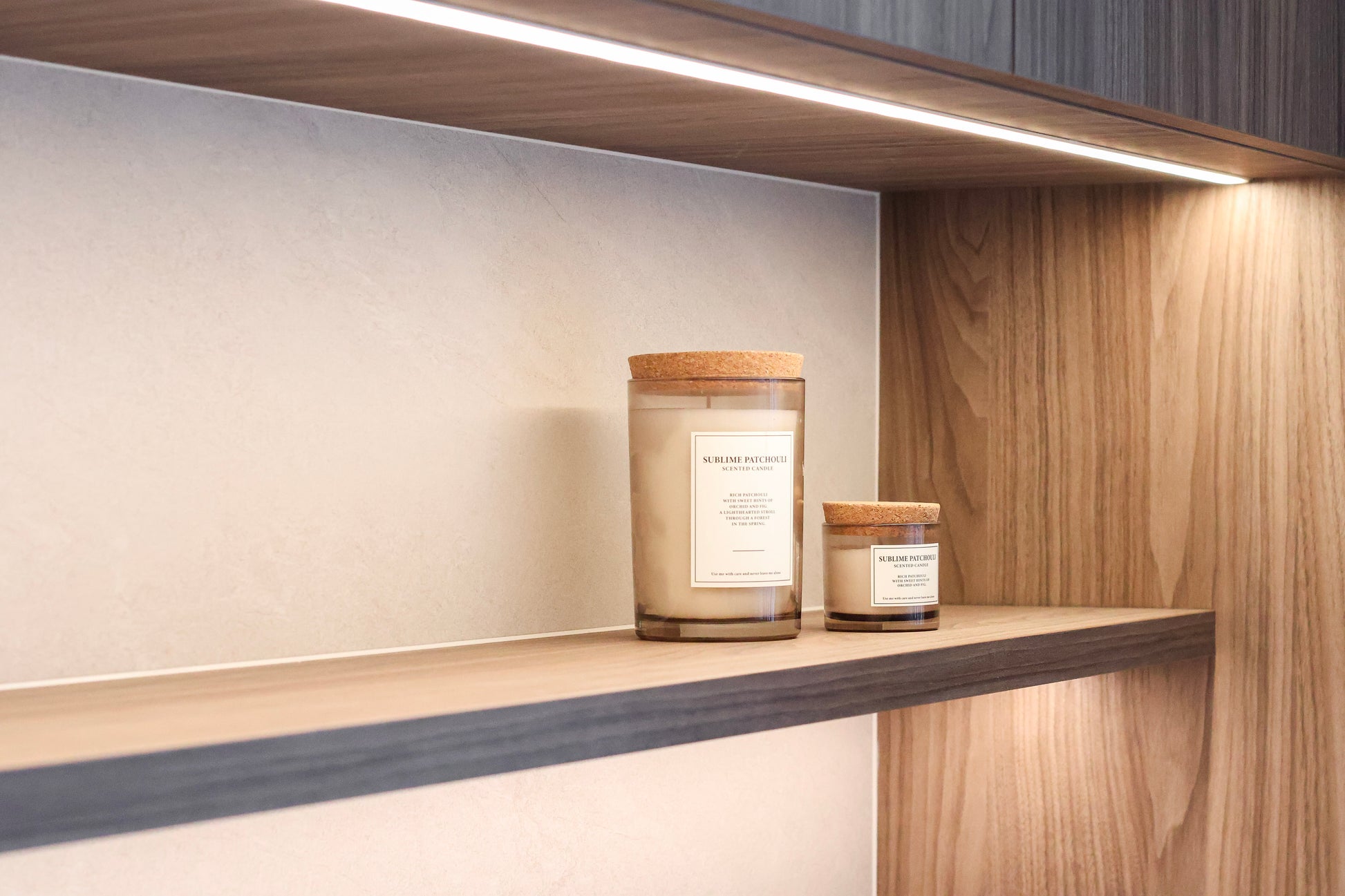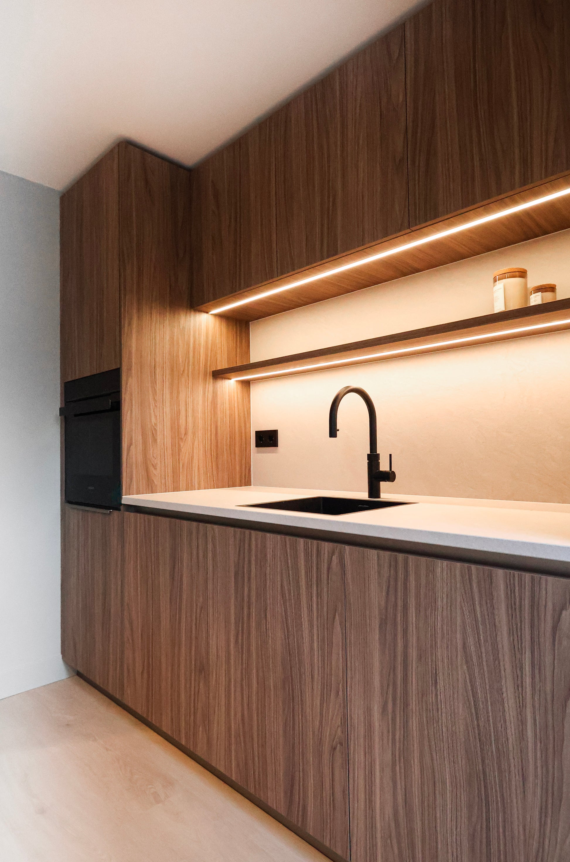 De warme houtstructuren en het lichte Porcelanosa werkblad zorgen voor een tijdloze, natuurlijke uitstraling. De keuken is voorzien van hoogwaardige Siemens-apparatuur, een Quooker en subtiel geïntegreerde verlichting, alles tot in detail afgestemd op het interieur.