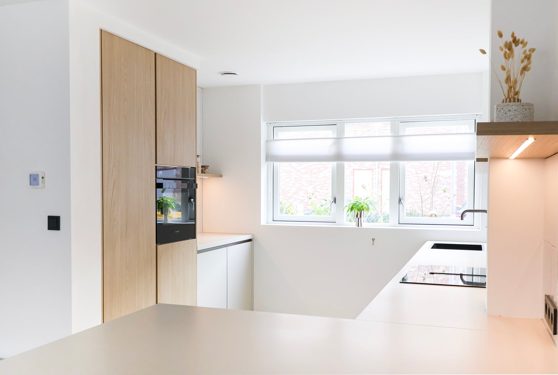 De keuken is een Italiaans maatwerkontwerp, afgestemd op de ruimte en uitgevoerd met oog voor detail. De combinatie van warme houttinten, lichte fronten en subtiele verlichting creëert een verfijnde balans tussen modern en tijdloos.