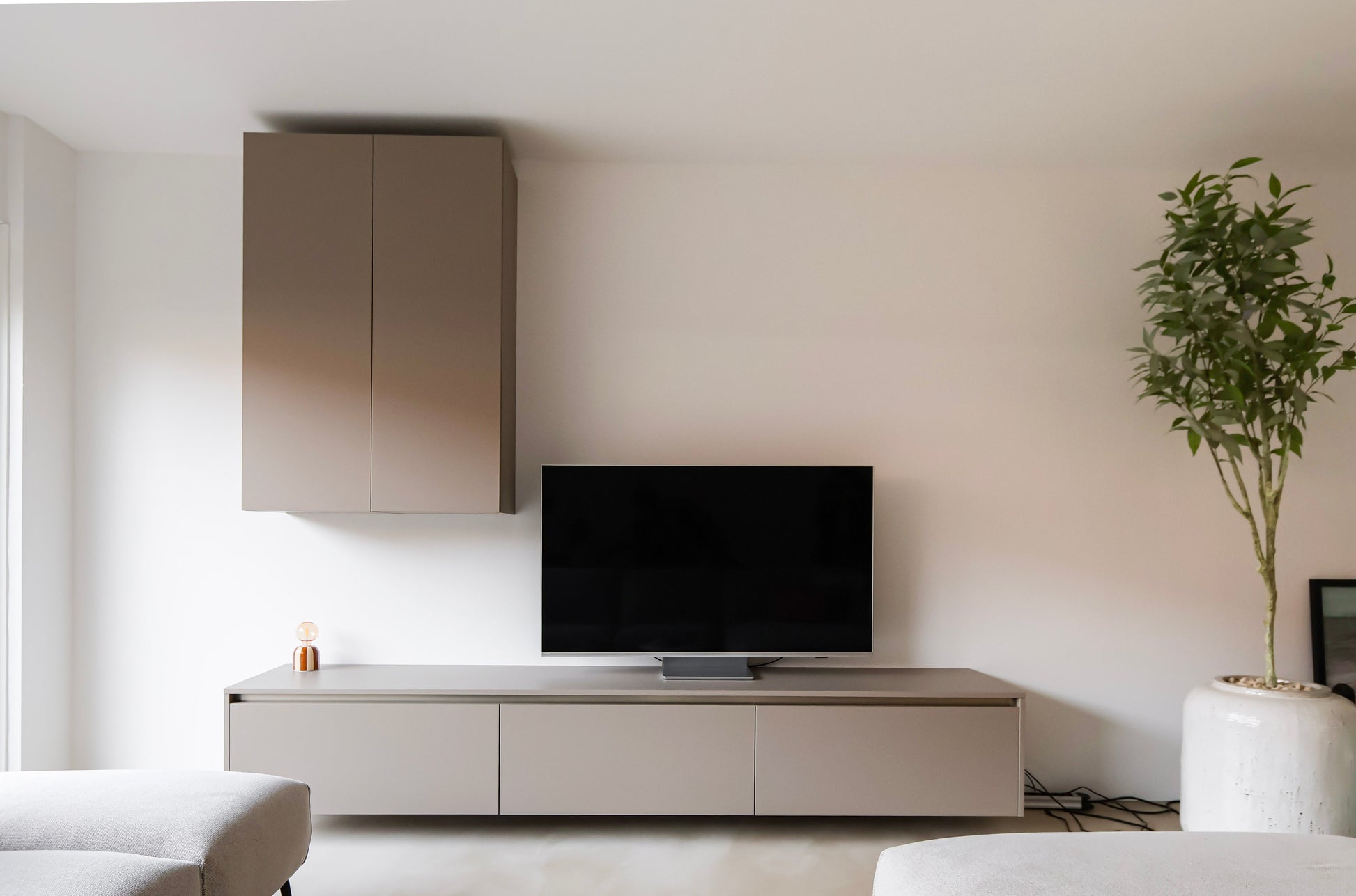 Ook het tv-meubel is op maat ontworpen in dezelfde Italiaanse stijl, waardoor woonkamer en keuken één geheel vormen. De hoogwaardige afwerking en het doordachte lijnenspel versterken de rust en elegantie van het interieur.