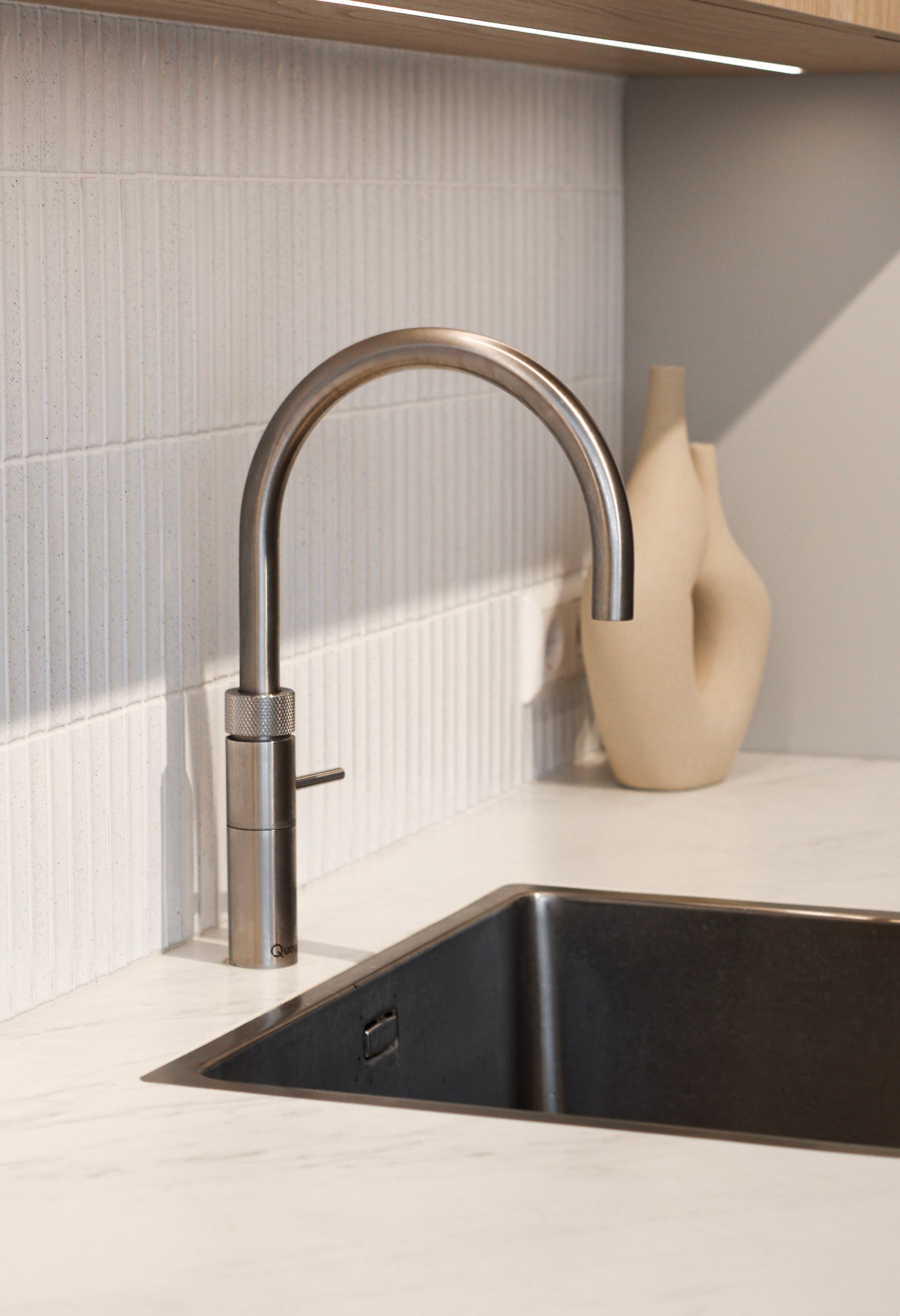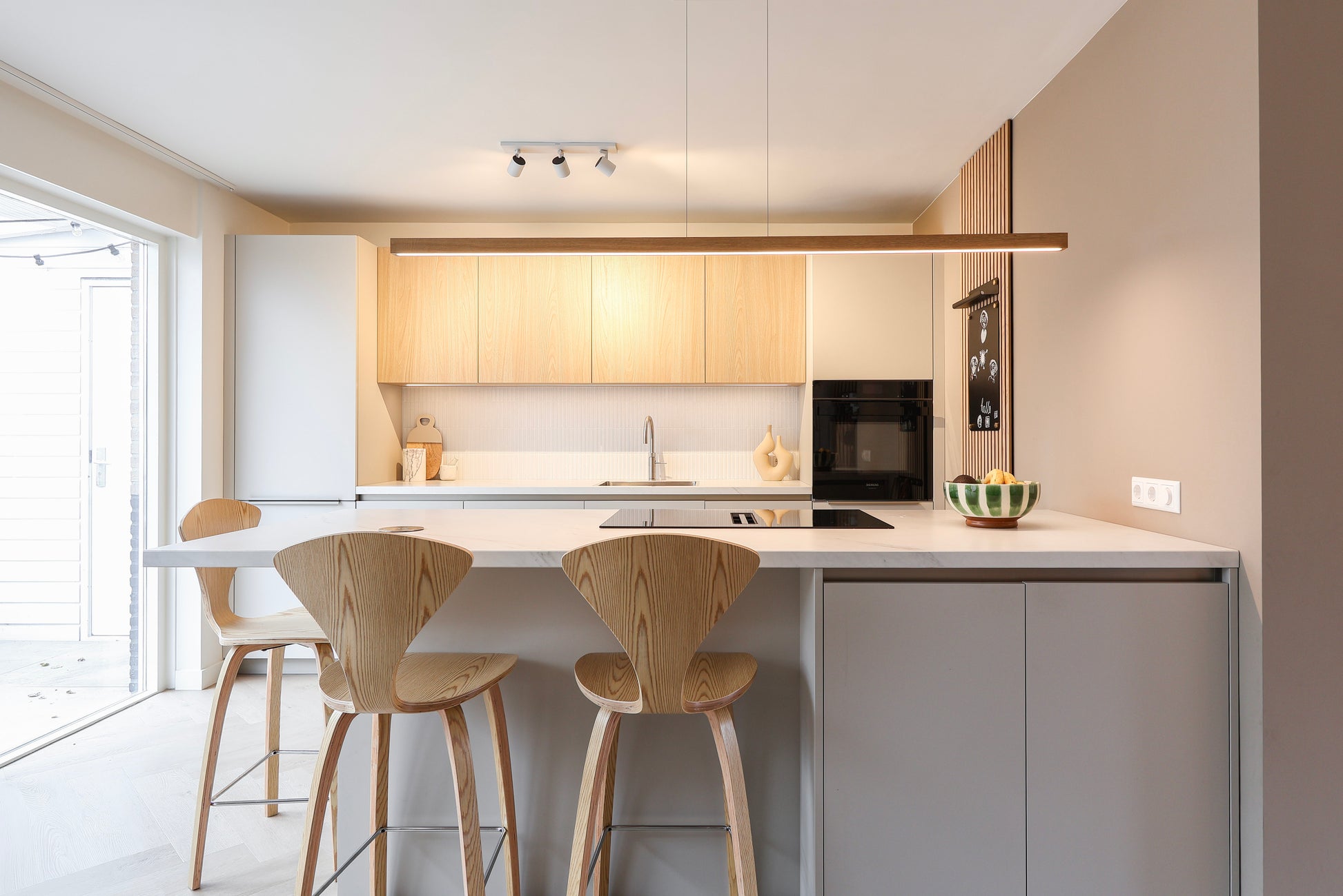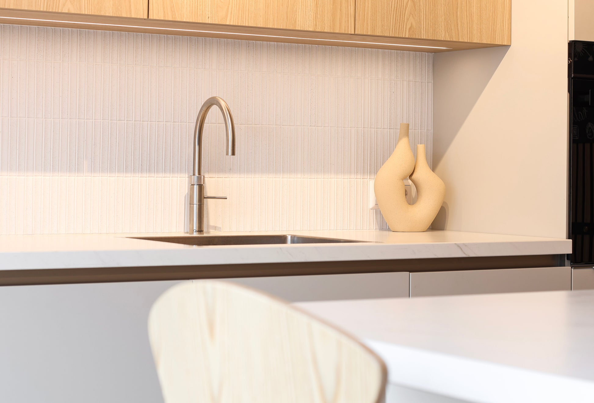 De keuken is uitgerust met Siemens apparatuur die strak in het ontwerp is opgenomen. Met de Quooker binnen handbereik is comfort nooit ver weg. De verticale lattenwand bij het kookgedeelte vormt een stijlvol accent dat het geheel verfijnt en optisch warmte toevoegt.