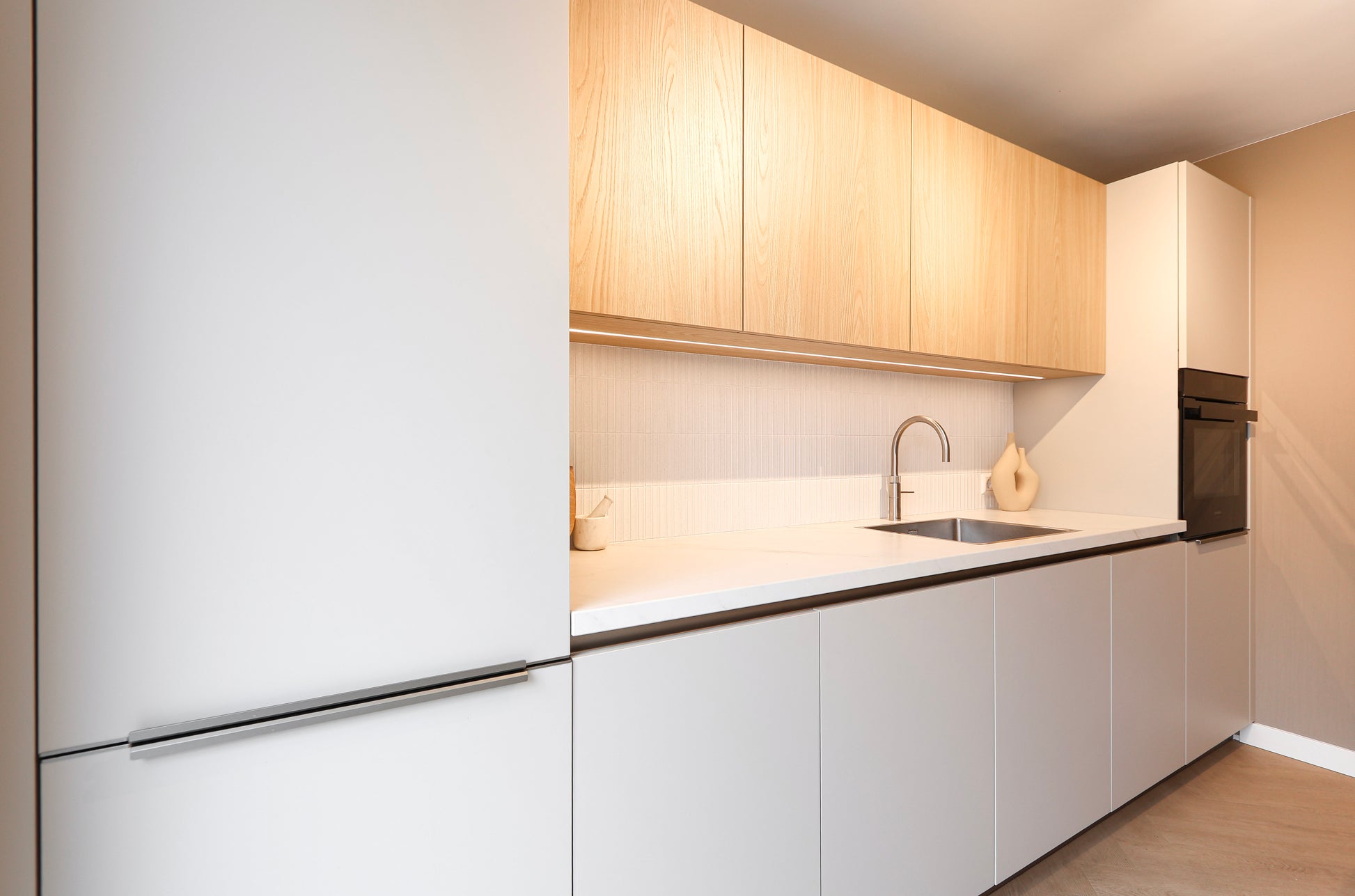 In dit project creëerde MORSS Kitchen & Interior een lichte, moderne keuken waarin rust, functionaliteit en stijl samenkomen. De combinatie van matte fronten in een zachte tint en warme eiken bovenkasten zorgt voor een serene en natuurlijke uitstraling. Het geheel voelt luchtig en ruimtelijk aan, mede dankzij het rustige lijnenspel en de greeploze afwerking.