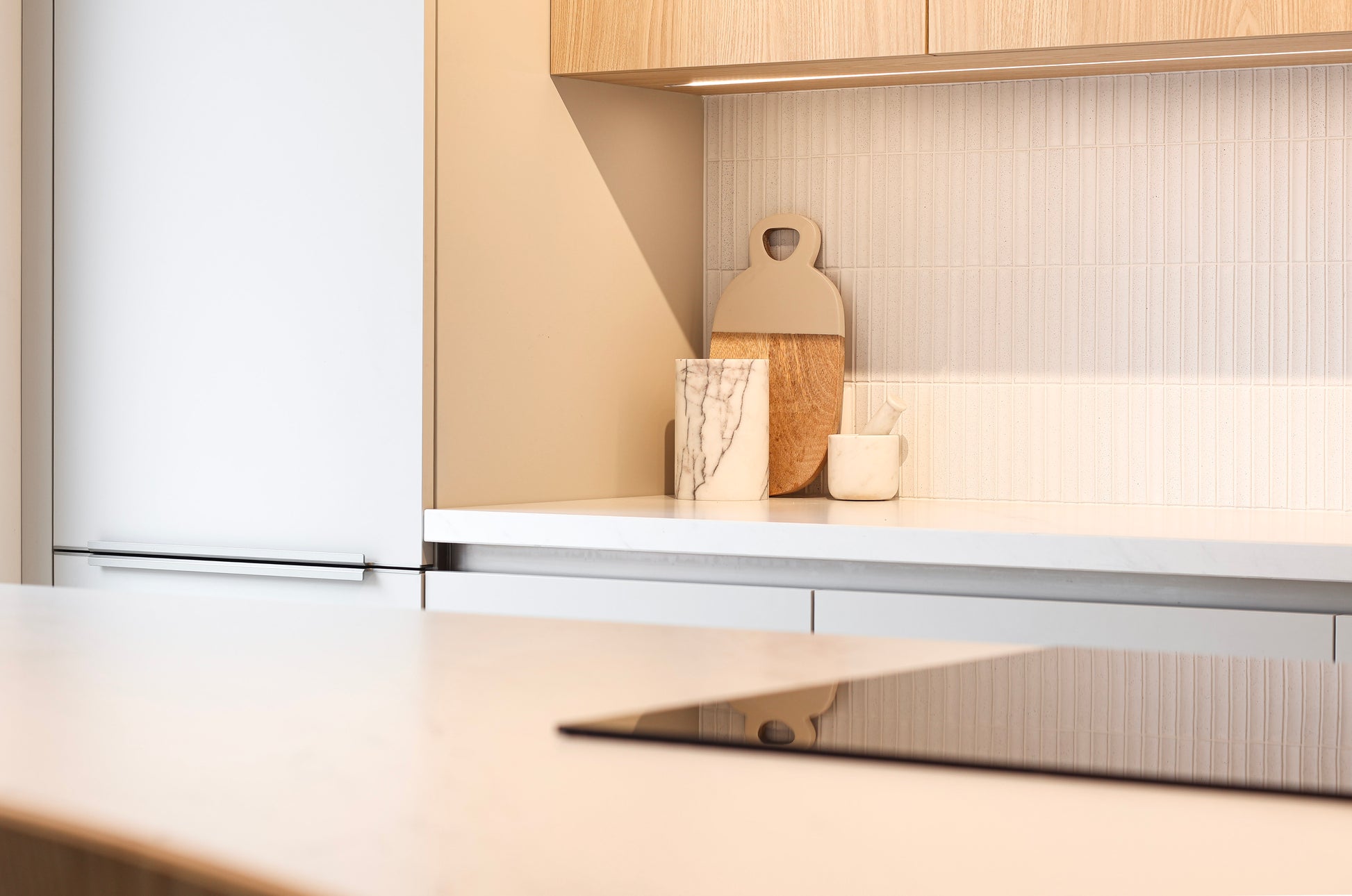 Het Dekton werkblad vormt een elegante basis, met een subtiele marmerstructuur die perfect aansluit bij de lichte kleuren in het interieur. De fijne structuurtegel op de achterwand geeft extra diepte en textuur, zonder de balans te verstoren. Onder de bovenkasten zorgt de geïntegreerde verlichting voor een warme, uitnodigende sfeer tijdens het koken én in de avonduren.