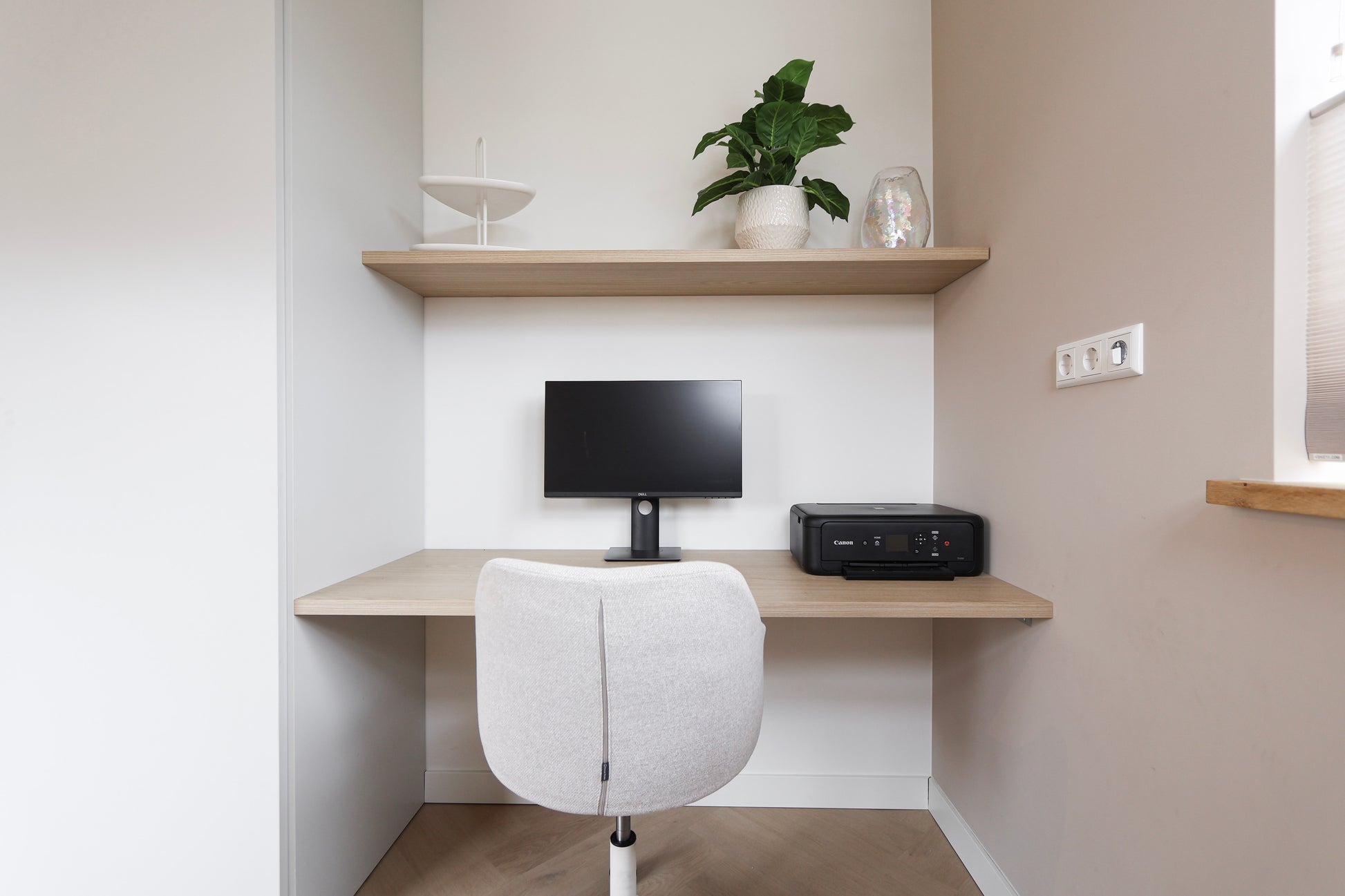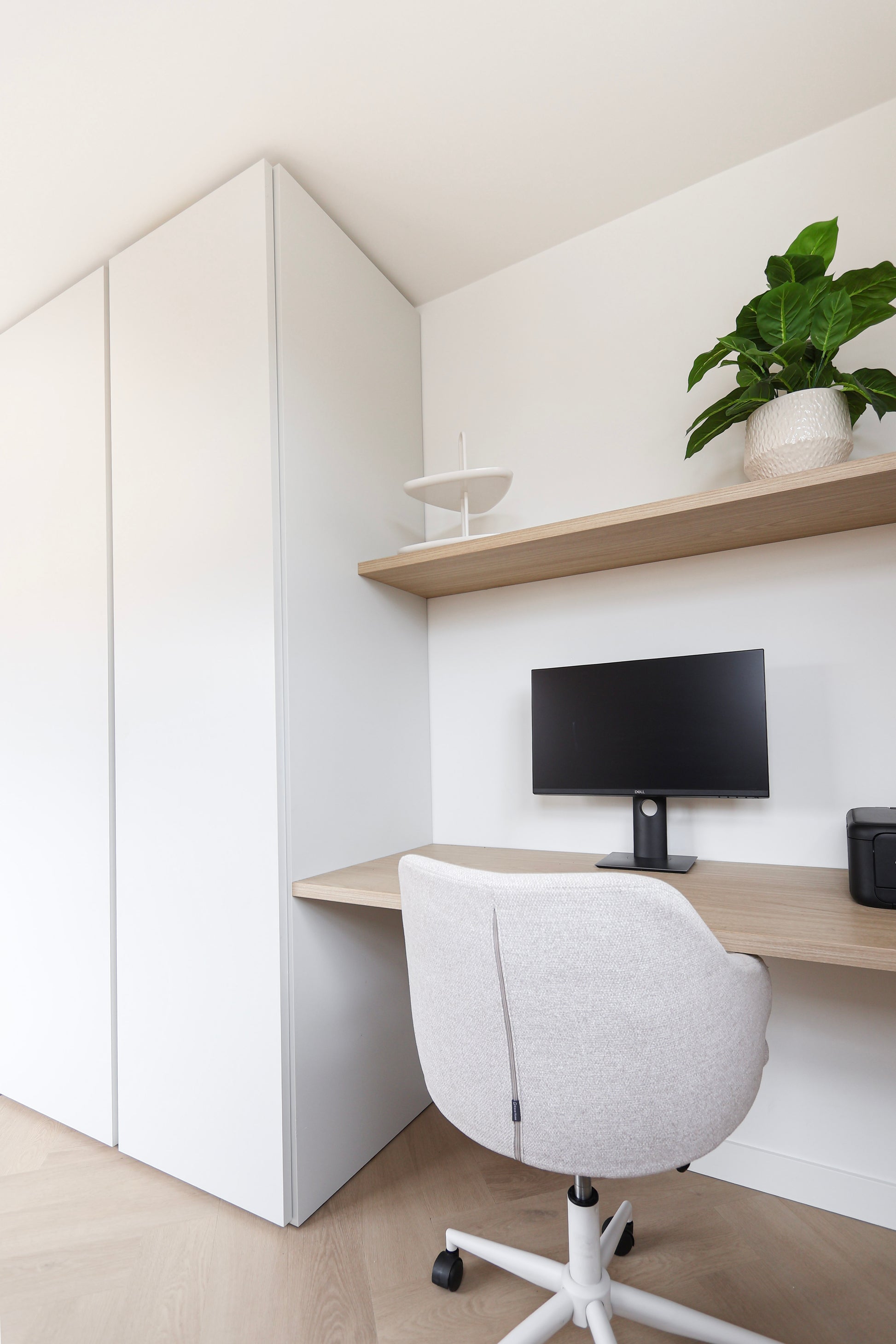 Naast de keuken realiseerden we een compacte werkplek in dezelfde rustige materialen. Het maatwerk bureau en de zwevende plank sluiten volledig aan op de sfeer van de keuken, waardoor een harmonieuze overgang ontstaat tussen koken, wonen en werken.