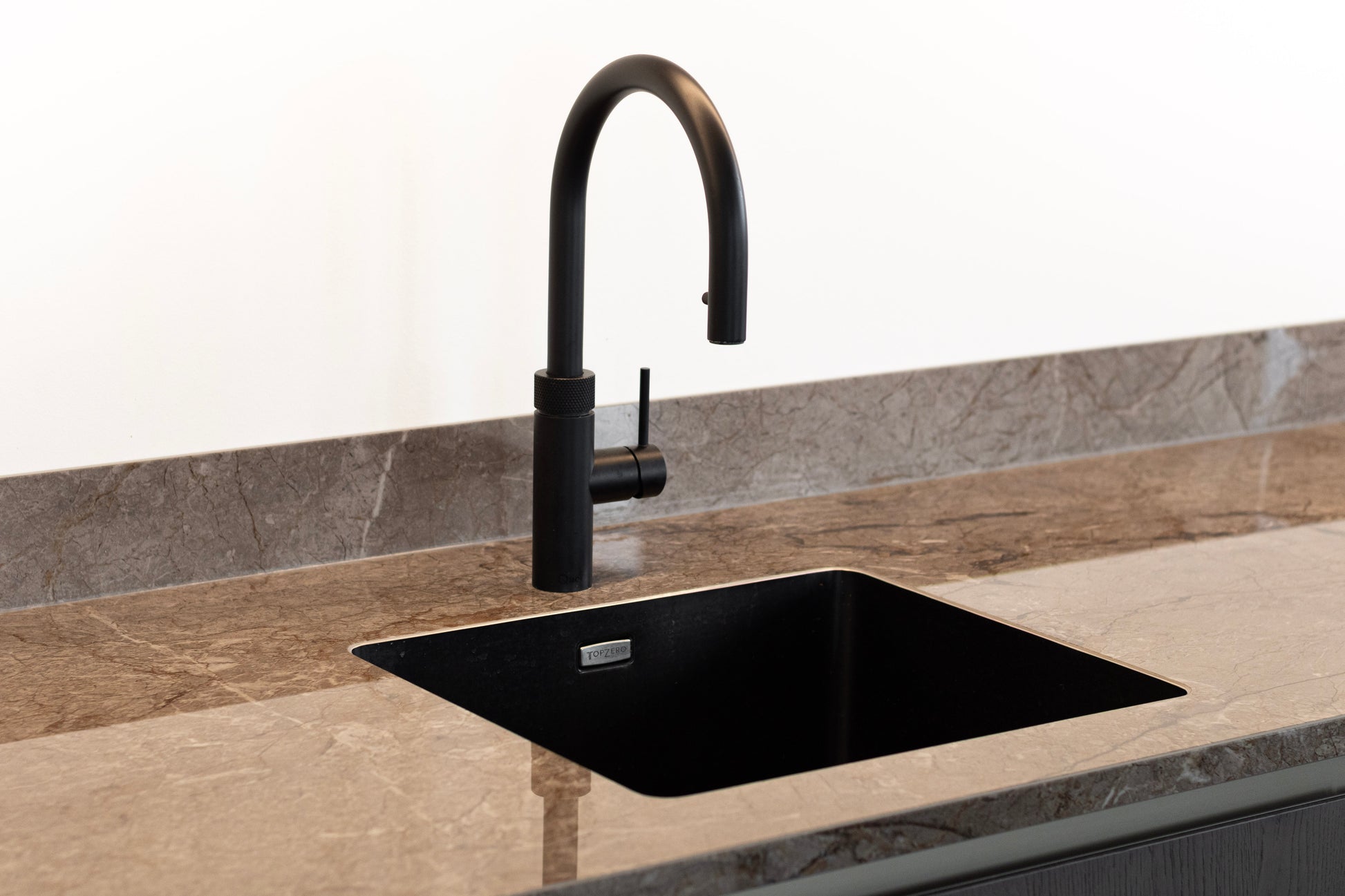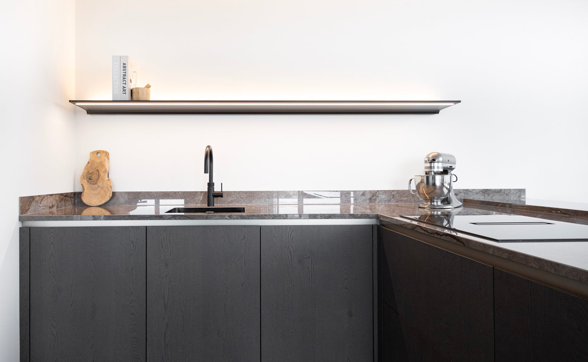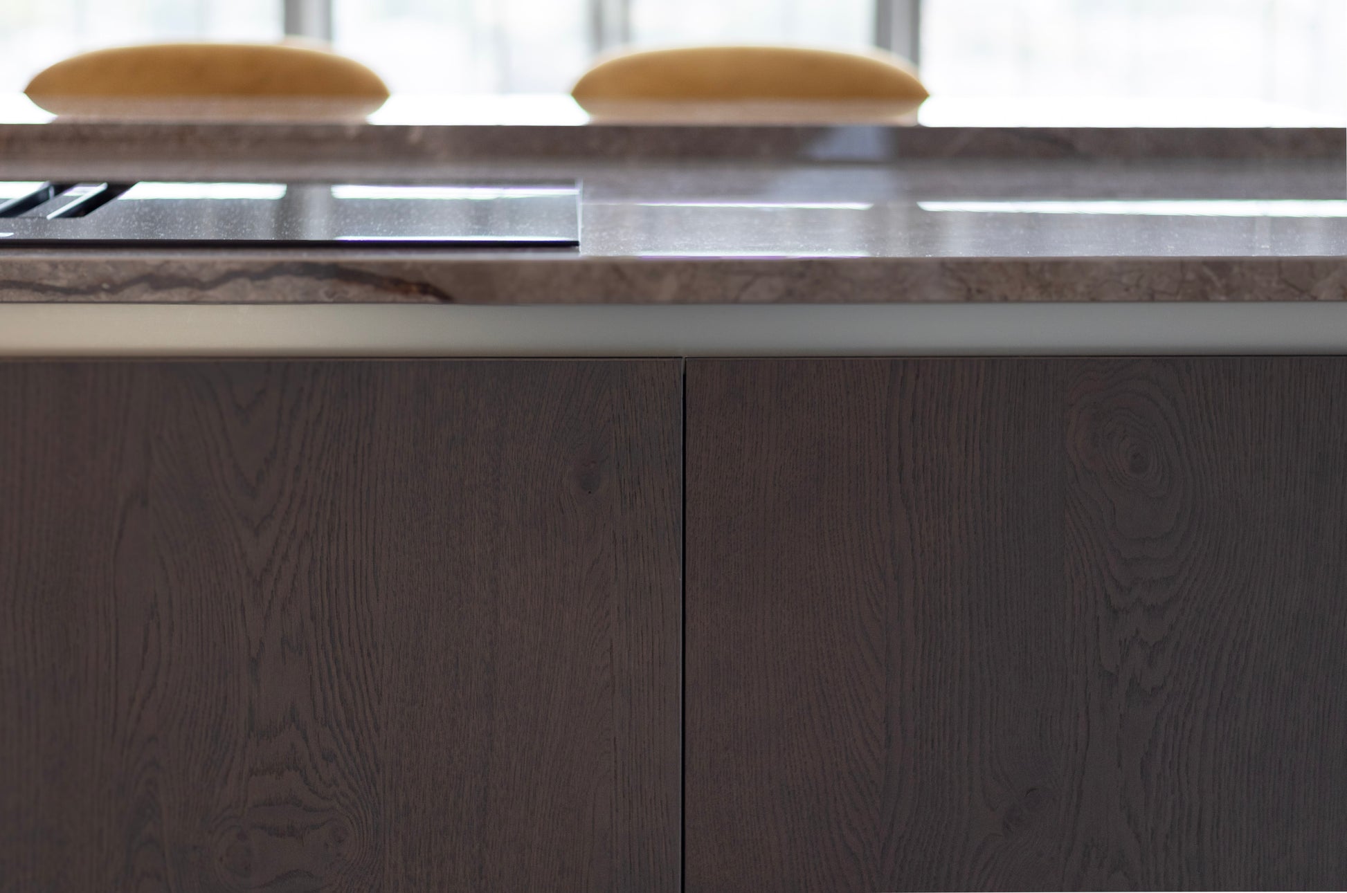 De rijke bruintinten in zowel het werkblad als de keukenfronten geven de ruimte een warme en chique sfeer. Door het gebruik van verschillende materialen in de afwerking blijft de keuken spannend en boeiend. Het glanzende werkblad voegt bovendien een elegante weerspiegeling en extra diepte toe aan het geheel.