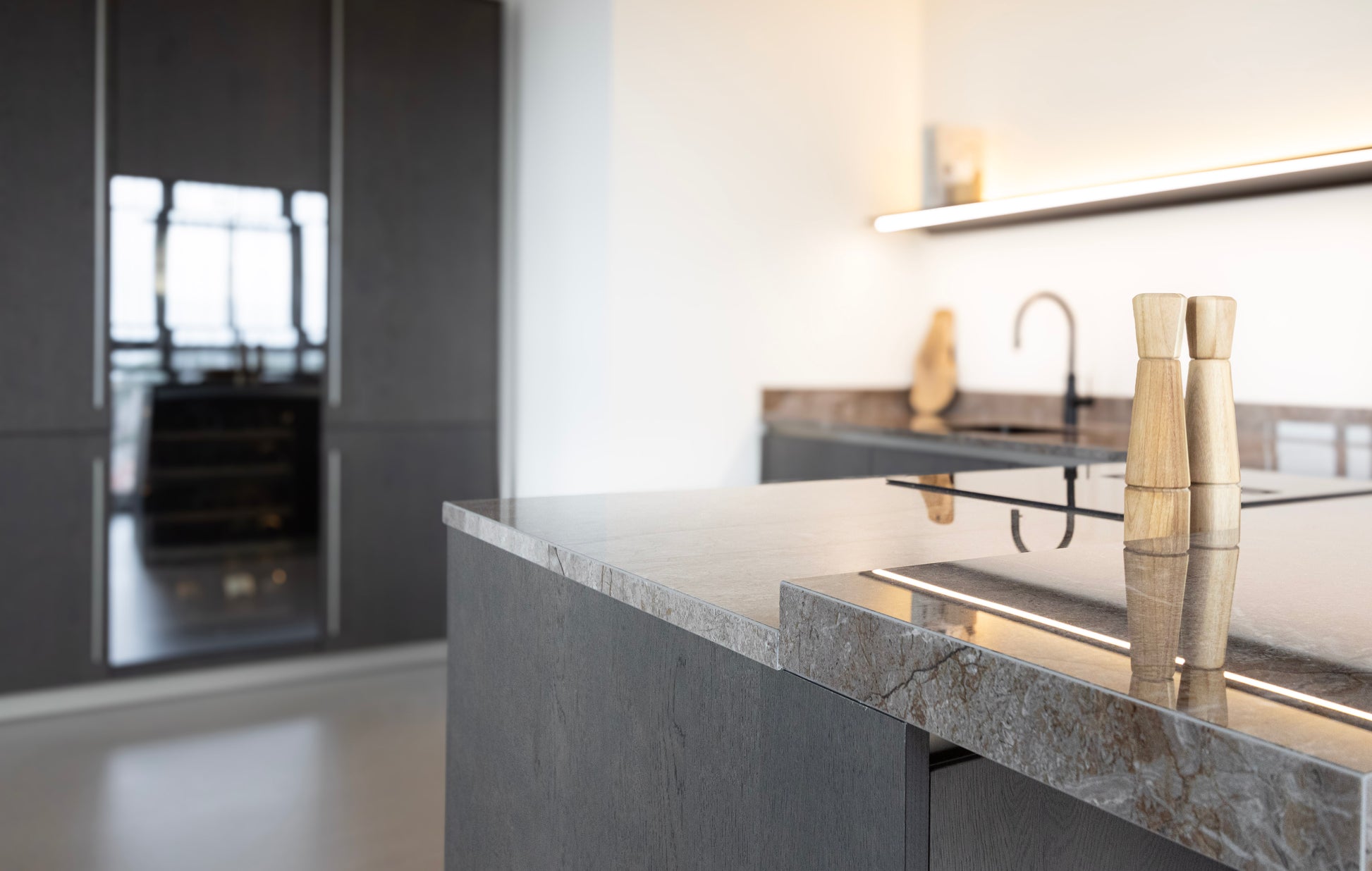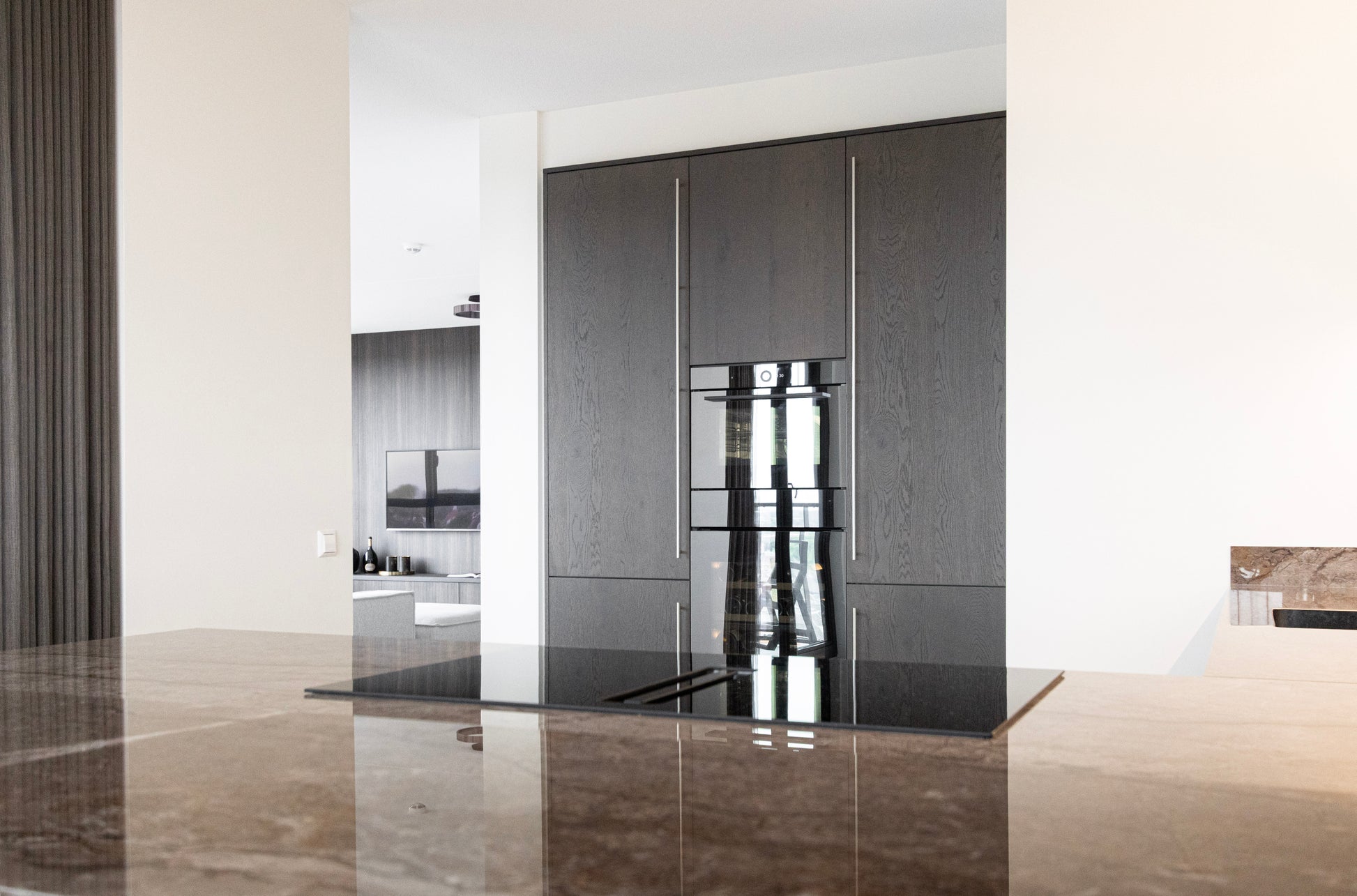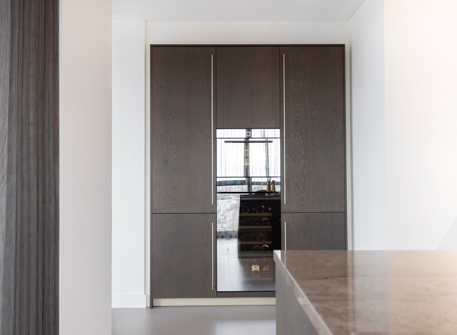 Ook bij de keuze van keukenapparatuur is de luxe uitstraling doorgezet. De oven en wijnklimaatkast van V-ZUG zijn geïntegreerd in de kastenwand en vormen een stijlvol middelpunt. De lange grepen benadrukken de hoogte van de kastenwand en creëren een strak lijnenspel dat perfect aansluit bij het moderne design.